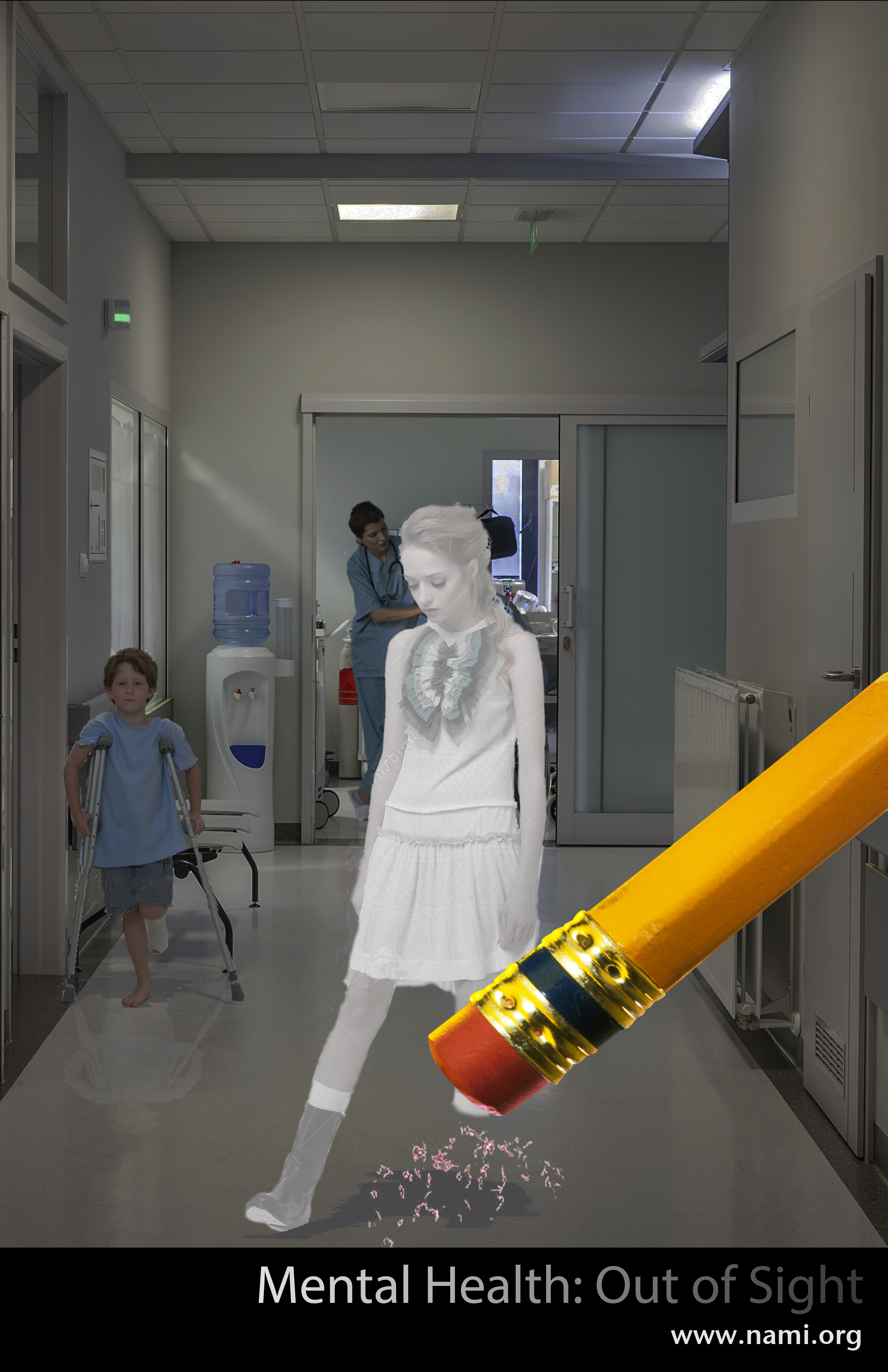 This project was done completely in Adobe Photoshop. I took assets from several different pictures and composited them into a hallway shot. I then added shadows and reflections for the figures. I then color corrected down to give it a darker pallet while lightening the for figure as if they were getting bleached out. I composited in a pencil and added some pencil shavings to complete the scene. A small banner with the PSA name and organization finish the poster.