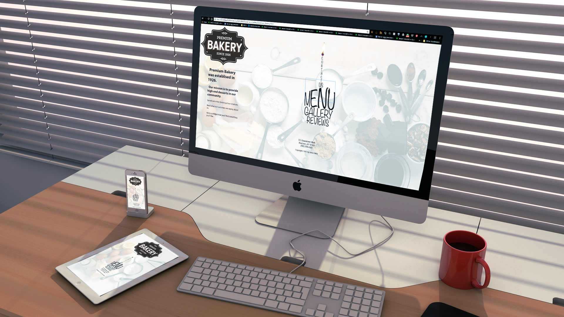 The menu was created using Adobe Illustrator. The web site was build using Adobe Dreamweaver. To show what the web site might look like on a variety of devices, the mock up image, pictures to the right, was created using screenshots manipulated in Adobe Photoshop.