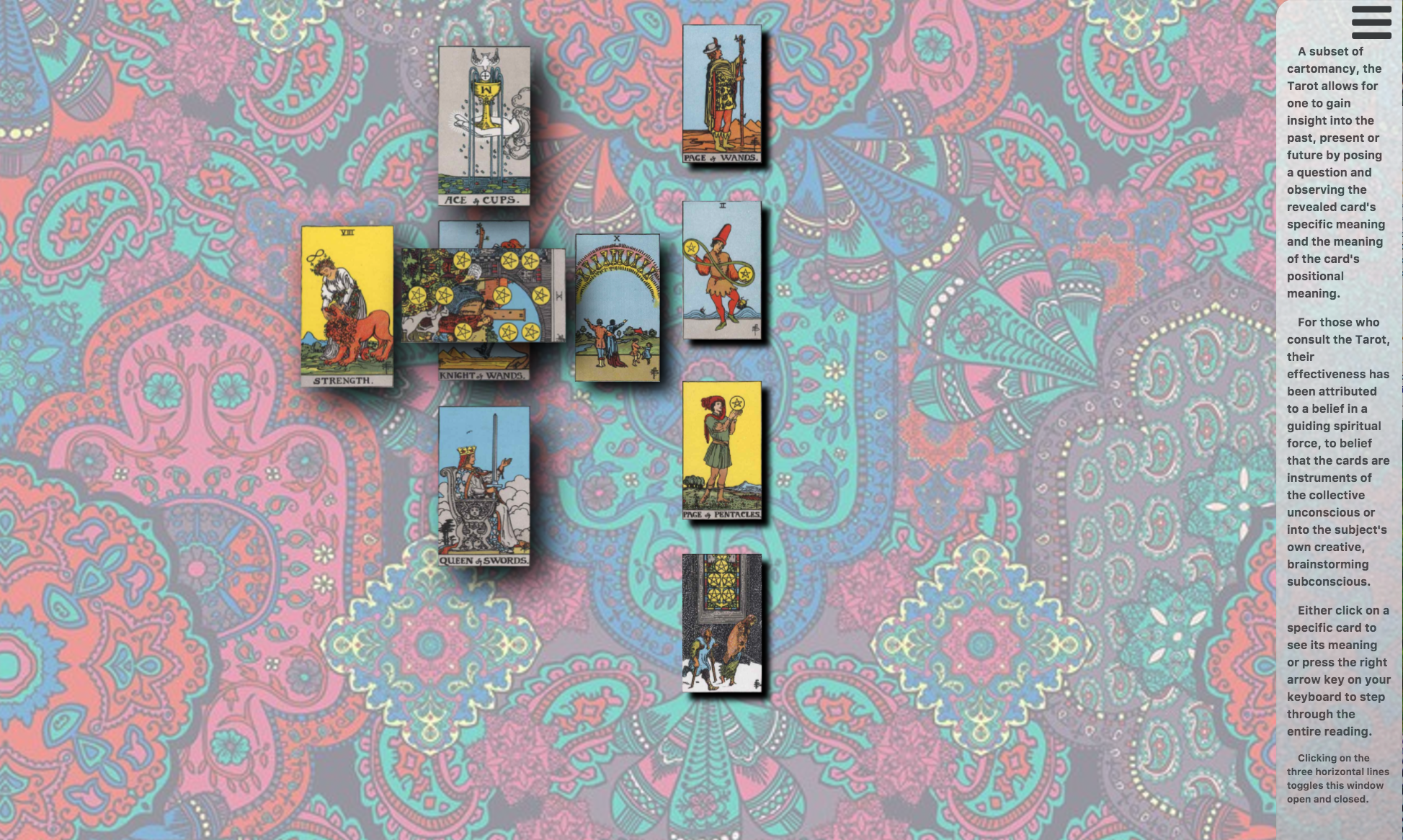 For IM 398 Projects II one of projects I chose to do was build a website that shuffled and displayed a celtic cross tarot card reading. The user can either click on a specific card to see it's meaning and it's positional meaning.